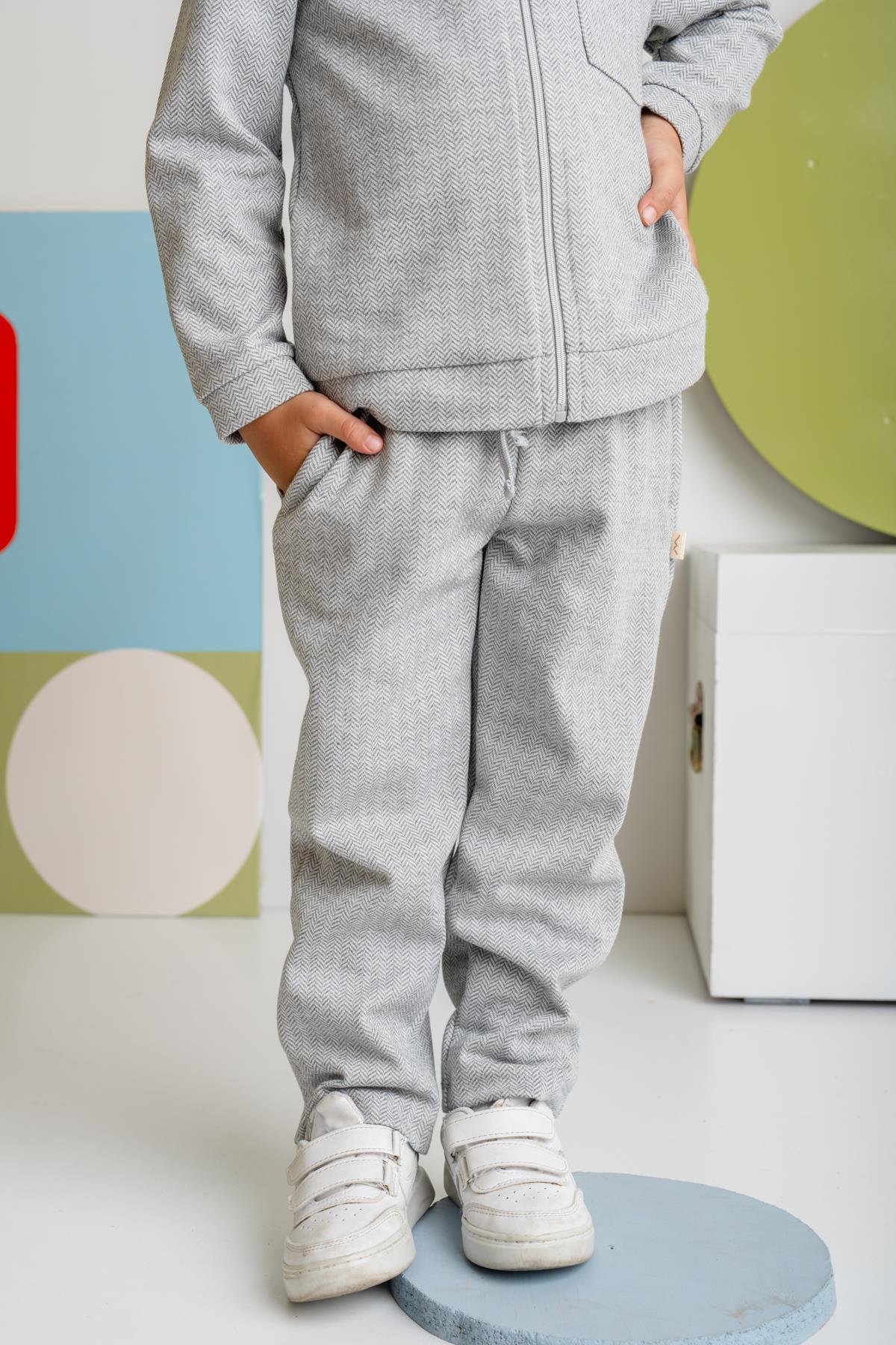 Çocukların gün boyu konforla hareket etmesi için tasarlanan gri desenli eşofman altı, şık ve modern dokusuyla dolapların vazgeçilmez parçalarından biri olacak. Balıksırtı desenli kumaşı sayesinde sade ama stil sahibi bir görünüm sunarken, gri rengiyle her renkten üst giyimle kolayca kombinlenebilir.