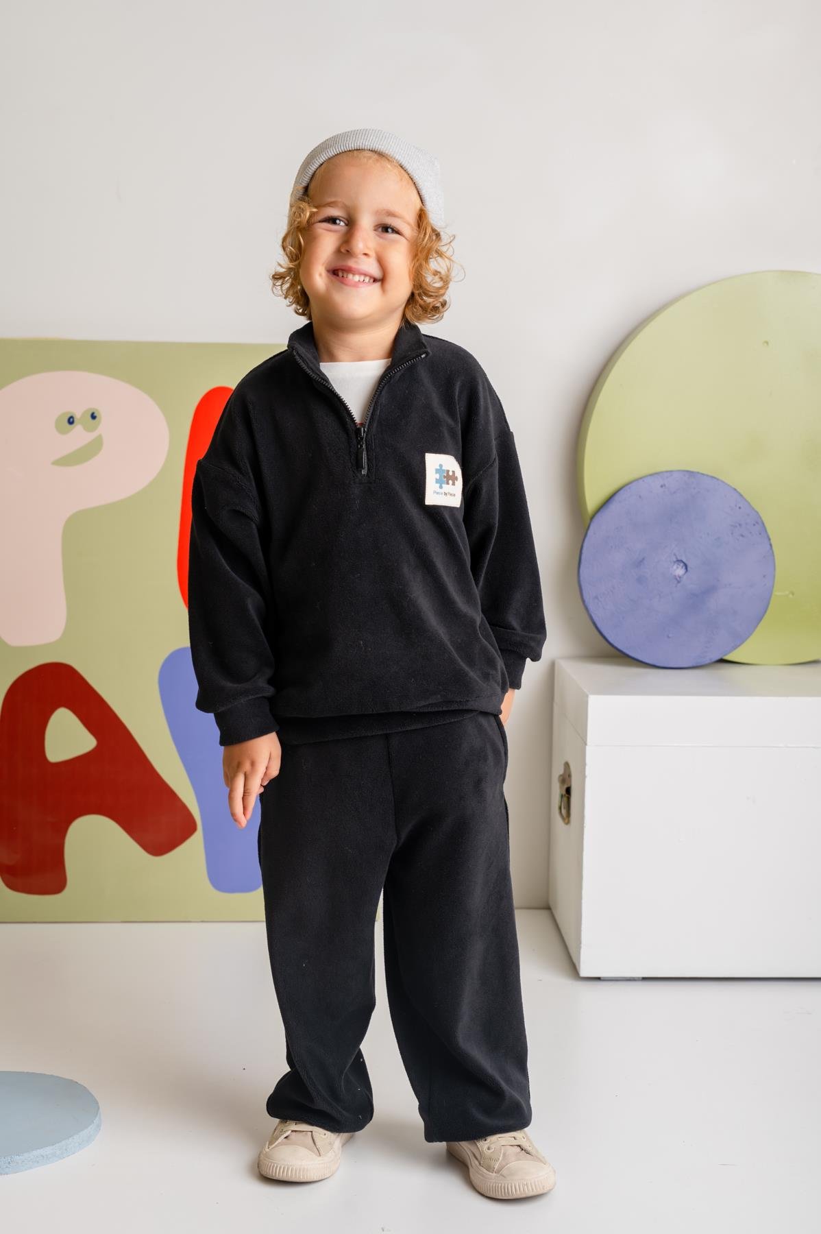 Çocuğunuzun hem şık hem de rahat görünmesi için tasarlanan siyah yarım fermuarlı çocuk eşofman takımı, gün boyu hareket özgürlüğü sunuyor. Üst kısmı yarım fermuar detayıyla pratik bir kullanım sağlarken, göğüs bölümündeki puzzle baskısı ve “Piece by Piece” yazısı modern bir stil kazandırıyor. Alt parça ise lastikli bel ve paça detayıyla maksimum konfor sunuyor.