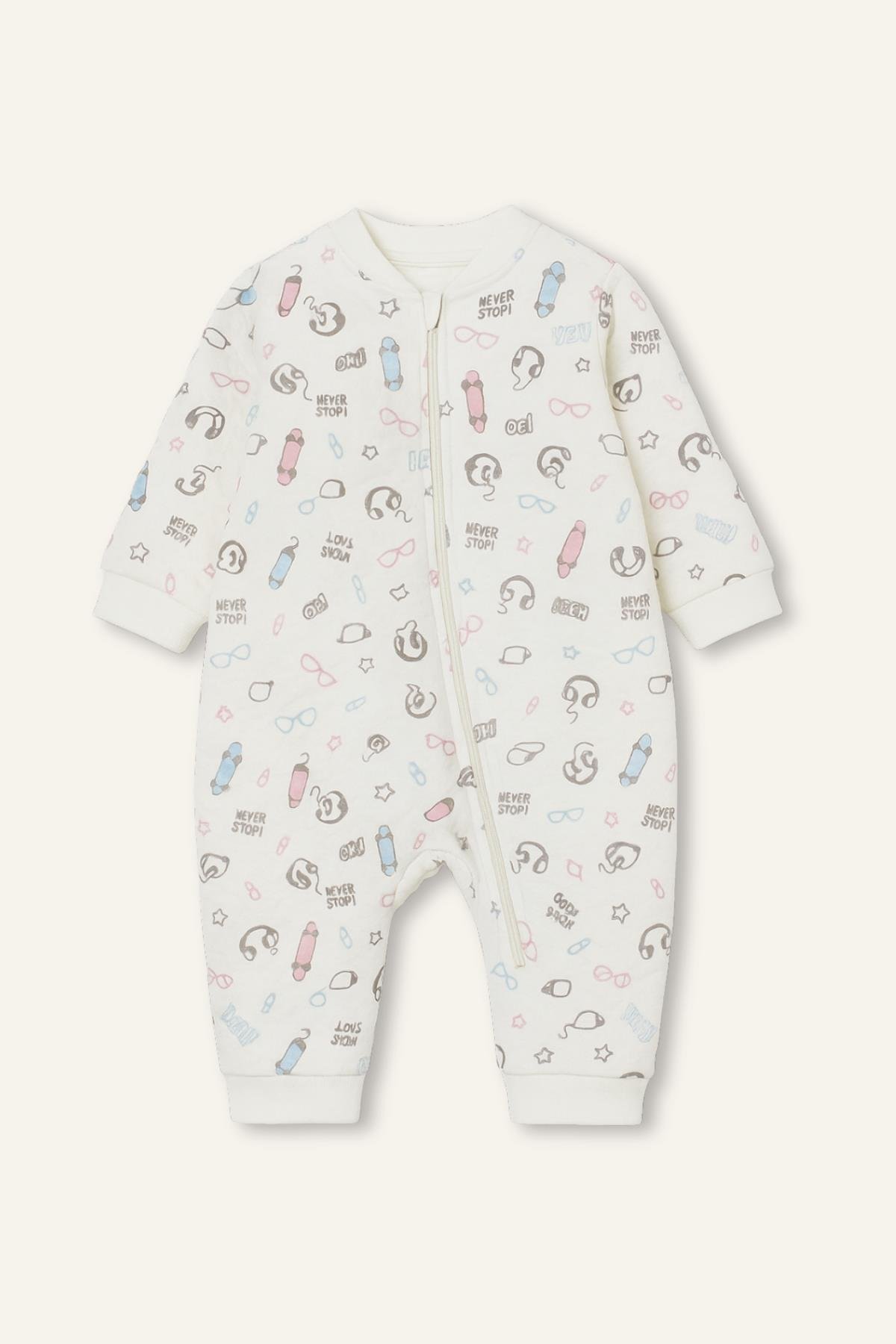Bebeğinizin uyku konforunu artırmak için tasarlanan çift kat pamuk elyafsız uyku tulumu, yumuşak dokusu ve nefes alabilen yapısı ile gece boyu rahatlık sunar. Beyaz zemin üzerine renkli kulaklık, gözlük, termos ve eğlenceli desenleri ile hem şirin hem de enerjik bir görünüm kazandırır.